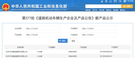 公示信息显示,小米汽车产品商标为小米牌,两款车型均为纯电动轿车,生产企业均为北京汽车集团越野车有限公司。