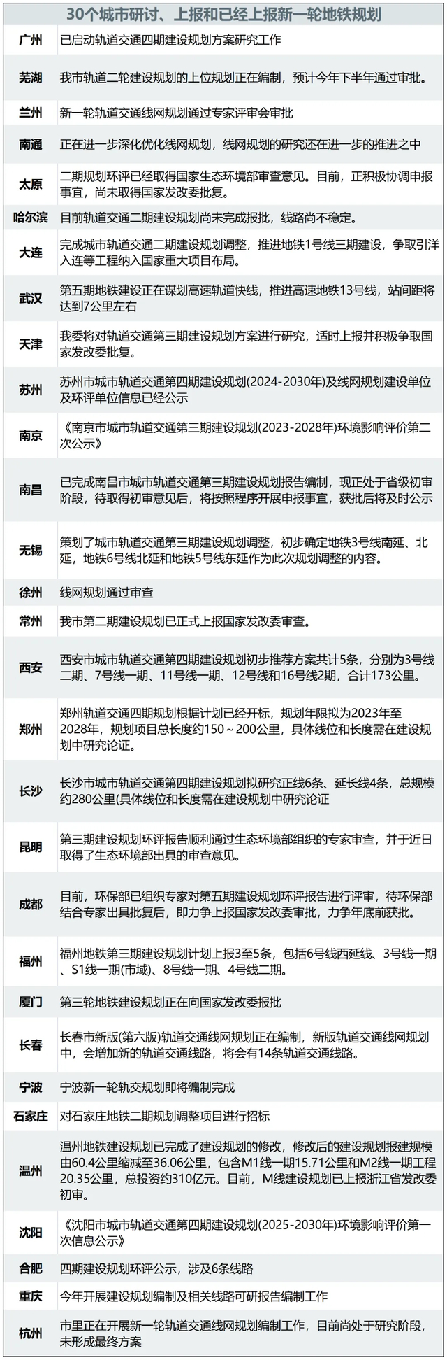 但更多的城市还在规划报批阶段,据不完全统计,包括芜湖、兰州、南通、太原、哈尔滨、大连等30多个城市开启了新一轮地铁建设规划报批或前期研究工作。