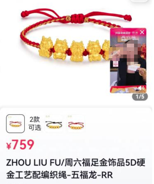 11月4日,记者在短视频平台“疯狂小杨哥”直播间看到,售价为669元的周六福五福龙足金手串,主播称在同平台其他主播直播间售价为1039元,并出示了销售页面截图。而记者随后在同平台周六福官方旗舰店发现其售价为759元。
