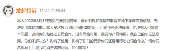 除了辅助驾驶,地图导航、看剧听音乐等娱乐功能也是新能源汽车的标配。但值得注意的是,消费者使用这些功能时需要连接网络,而车企一般会每月赠送8-20G不等的流量,赠送时间为2-3年,到期后或者每月超出的部分,后续需要付费才能继续享受。但是也不乏用户投诉网络无法正常使用的情况。