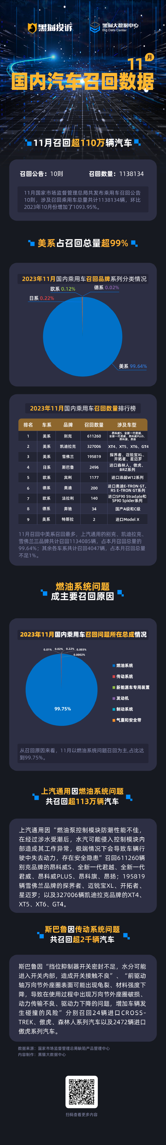 黑猫投诉发布11月国内汽车召回数据:上汽通用因燃油系统问题共召回超113万辆汽车