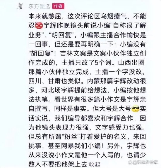 事情的起因,源自几天前,东方甄选小编置顶了一则的一则 “ 宣传文案出自谁手 ” 的答复引发了董宇辉粉丝的不满。