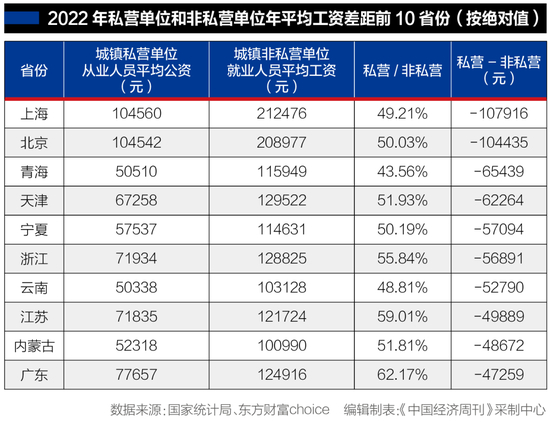 按绝对值对比,30个省份,私营单位从业人员2022年平均工资比非私营单位低2.9万元至10.79万元。差距大的是上海、北京和青海,三省份的城镇私营单位年平均工资,分别比非私营单位低10.79万元、10.44万元和6.54万元。差距小的是河南、江西和湖南,私营单位分别比非私营单位的低2.97万元、3.43万元和3.56万元。