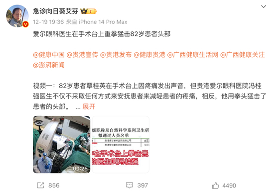 艾芬19日在拥有209万粉丝的微博账号“急诊向日葵艾芬”写道,82岁患者覃某在手术台上因疼痛发出声音,但贵港爱尔眼科医院医生冯某某不仅不采取任何方式来安抚患者来减轻患者的疼痛,相反,他用拳头猛击了患者的头部。