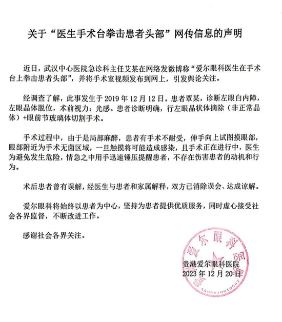 对于武汉市中心医院急诊科主任艾芬爆料“爱尔眼科医生在手术台上重拳猛击82岁患者头部”,爱尔眼科医院集团于12月21日深夜做出回应。