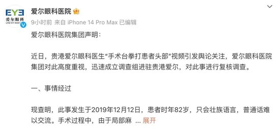 对于事情经过,爱尔眼科医院集团称,此事发生于2019年12月12日,患者只会壮族语言,普通话难以交流。手术过程中,由于局部麻醉,患者有手术不耐受。手术进行中,频繁转动头部和眼球,极可能发生手术意外。患者听不懂普通话,多次提醒无效,医生为避免发生危险,情急之中粗暴对待患者。医院次日收到患者反映术中手术医生动作粗鲁,要求做出相关解释。医院随即进行调查并向患者和家属详细解释并道歉,得到了患者家属谅解。此次视频曝光后,手术医生再次通过媒体真诚向患者道歉。