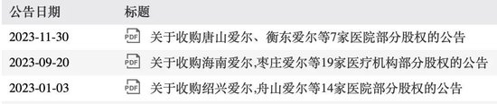 但爱尔眼科并没有停止并购医院的步伐。梳理公司公告发现,爱尔眼科年内曾3次发布收购兼并公告,分别收购14家、19家、7家,合计40家医院的部分股权,且收购股权比例都在50%以上。