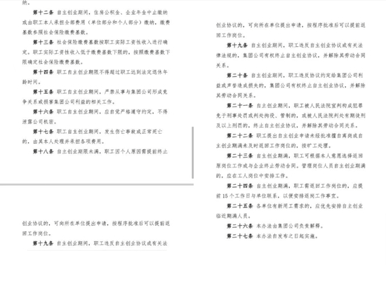 该《意见》共27条,其中包含:1.该办法适用于在集团公司工作满10年及以上的职工;2.创业期间离岗,集团公司保留其劳动关系;3.自主创业期限不超过2年;4.创业期间保留原职级,工龄可连续计算,管理人员不再保留其职务;5.期间停发工资、奖金和津贴补助,不再享受各项福利待遇;6.创业期间社会保险等费用由公司承担,住房公积金及企业年金终止或由本人承担缴纳;7.创业期间提前终止协议,可向所在单位提出申请,批准后可提前返回工作岗位等。