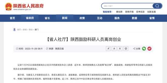 就在今年11月28日,陕西省政府新闻办公室召开的新闻发布会,鼓励高校、科研院所等单位科研人员离岗创办企业和兼职创新创业。