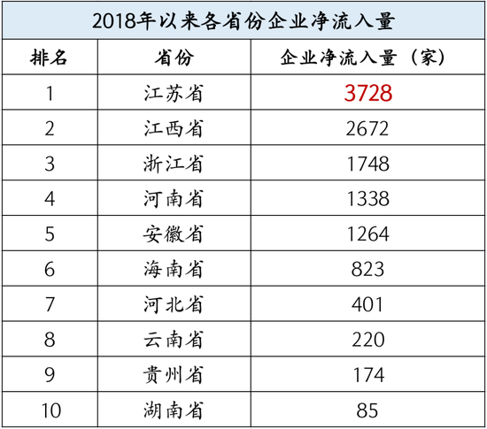 自2018年开始,5年以来,江苏一直都是企业净流入量最大的省份