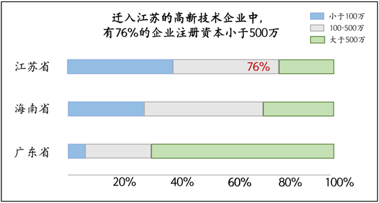 对比广东省多以注册资本超500万以上的大企业为主,江苏有76%迁入的高新技术企业