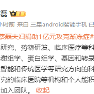 1月27日,蔡磊发博表示,将与夫人将再捐助1亿元,用于支持渐冻症的基础研究、药物研发、临床医疗等科研项目。盼望脑科学和神经系统疾病、免疫学、代谢组学、蛋白组学、基因和转录组学、干细胞、声光电磁、CDMO、CRO、人工智能和传统医学等研究方向的科学家、医生、生物医药公司和关注神经系统疾病研究的临床医院等机构和个人能积极与我们联系,同时也欢迎有情怀、有决心的人士加入团队。