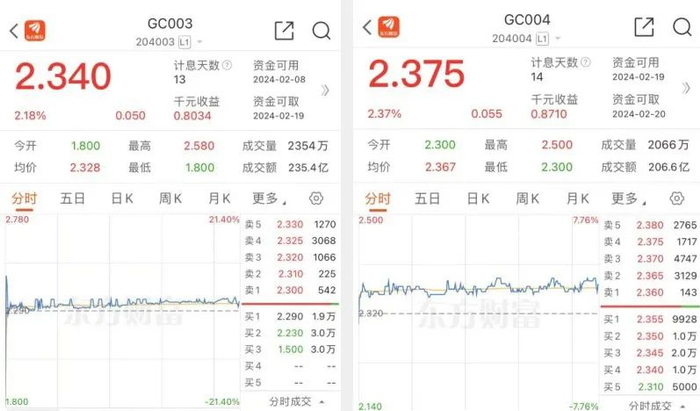 以本周一沪市国债逆回购的收盘价来看,3天期、4天期国债逆回购品种收益纷纷走高。截至当日收盘,GC003的收益率涨幅为2.18%,年化利率达到2.340%;GC004的收益率涨幅为2.37%,年化利率冲高至2.375%。