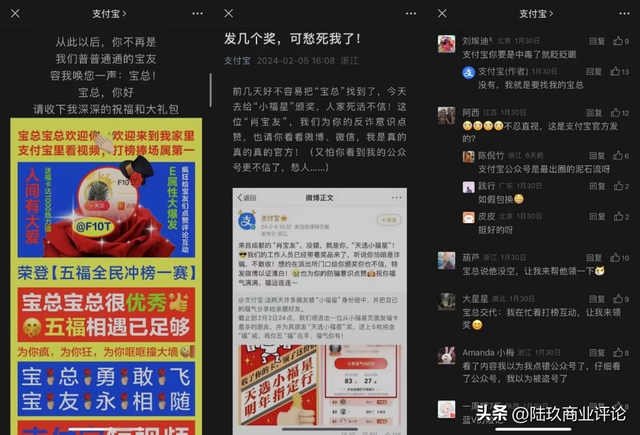 在今年支付宝推出的“五福全民冲榜赛”中,甚至连官微也亲自下场玩了起来,为榜一大哥“宝总”用户制作专属寻人海报。它在变得越来越有温度,越来越有亲和力,希望能找到更多宝友一起玩。