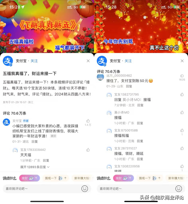 与普罗大众喜闻乐见的“集五福”玩法相比,这届年轻人们却把五福玩出了另一朵“花”,他们用福卡换0元购周边、蹲守“天天福”的口令薅羊毛、6000万人去官方五福MV评论区排队“接财”,甚至引得官方亲自下场寻找支付宝五福全民冲榜赛榜一大哥“宝总”发出大礼包。