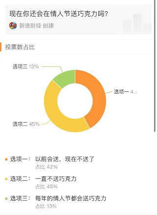一份由新浪财经发起的投票显示,有42%的消费者以前会在情人节送巧克力,但现在不送了;另有占比45%的消费者表示情人节一直不送巧克力,仅有占比13%的消费者表示自己会在情人节送巧克力。