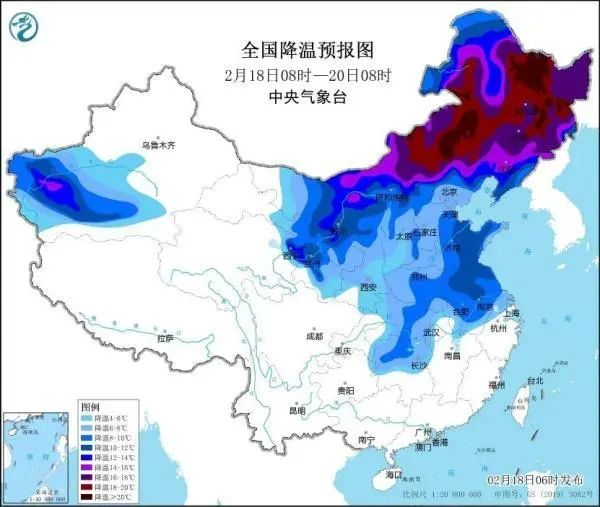 新疆南疆盆地、内蒙古大部、西北地区东部、华北大部、东北地区、黄淮、江淮、江汉、江南、华南中北部及贵州等地气温将下降12~18℃,其中,内蒙古中东部、东北地区及湖北、湖南等地的部分地区累计降温幅度可达20℃以上。2月23日前后,最低温度0℃线将南压到苏皖中南部至湖南南部、贵州南部一带。