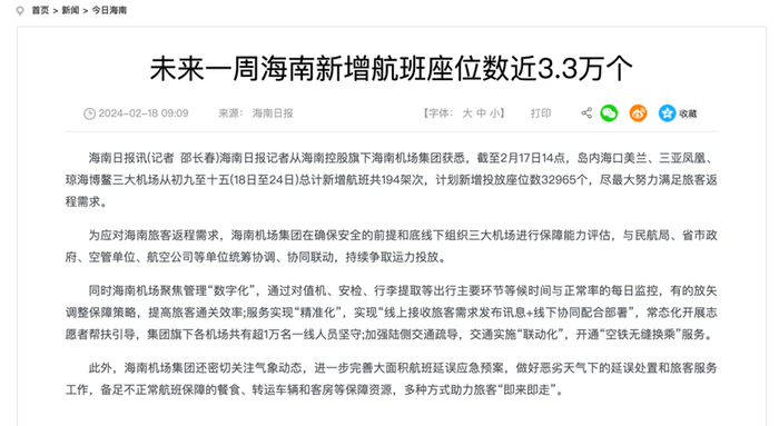 据海南日报消息,截至2月17日14点,岛内海口美兰、三亚凤凰、琼海博鳌三大机场从初九至十五(18日至24日)总计新增航班共194架次,计划新增投放座位数32965个,尽最大努力满足旅客返程需求。