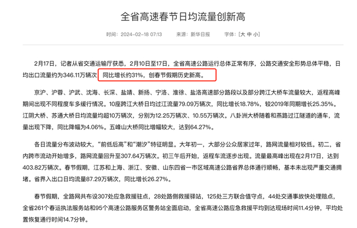 据江苏省交通运输厅消息,2月10日至17日,全省高速公路日均出口流量约为346.11万辆次,同比增长约31%,创春节假期历史新高。
