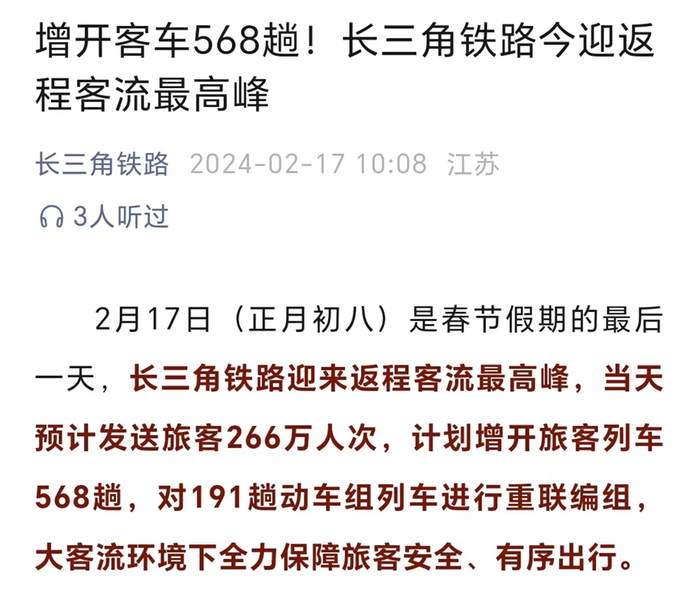 据中国铁路上海局集团消息,2月17日长三角铁路迎来返程客流最高峰,当天预计发送旅客266万人次,计划增开旅客列车568趟,对191趟动车组列车进行重联编组。