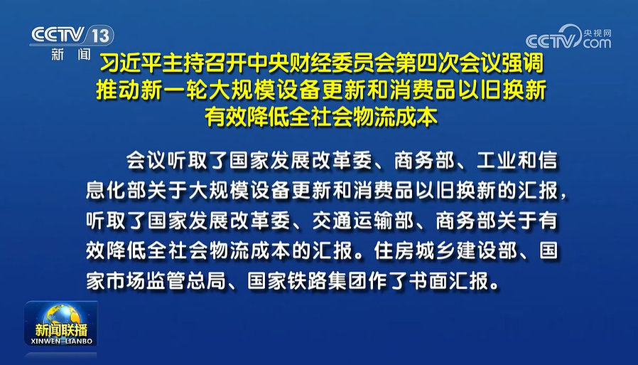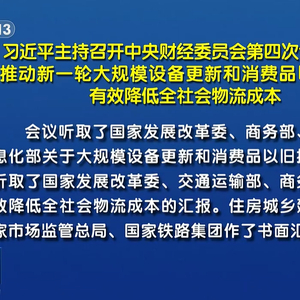 [视频]习近平主持召开中央财经委员会第四次会议强调 推动新一轮大规模设备更新和消费品以旧换新 有效降低全社会物流成本