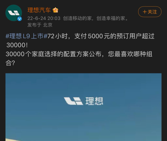 笔者搜索发现,2022年6月,理想L9上市后,理想宣布,L9上市72小时,支付5000元的预订用户超过3万。