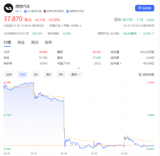 截至3月6日收盘,理想汽车美股股价报37.87美元/股。