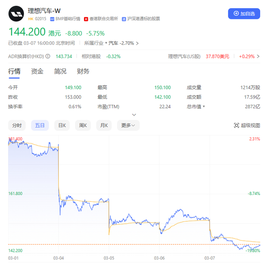3月4日,理想汽车港股股价跌10.71%;3月5日港股开盘,理想汽车跌8.06%,截至5日收盘,理想汽车港股股价再跌5%,报152港元/股,总市值3028亿港元。
