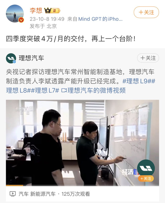 10月8日,李想转发了理想汽车的一条微博,并表示,“四季度突破4万/月的交付,再上一个台阶!”