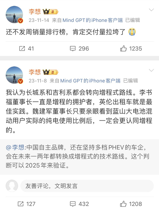 11月9日,李想发表了一些对增程式的观点,6天后发文“还不发周销量排行榜,肯定交付量拉胯了”。