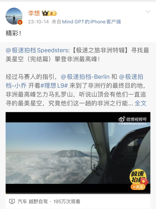 10月14日,李想恢复更新,转发了一条关于理想L9的视频。