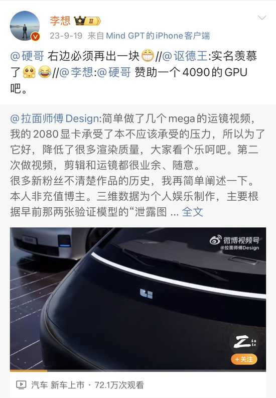 理想MEGA发布之后的第二天,李想在微博转发了一条某汽车自媒体和理想MEGA设计师BenBaum的访谈视频,并配文表示,Ben的访谈非常好。