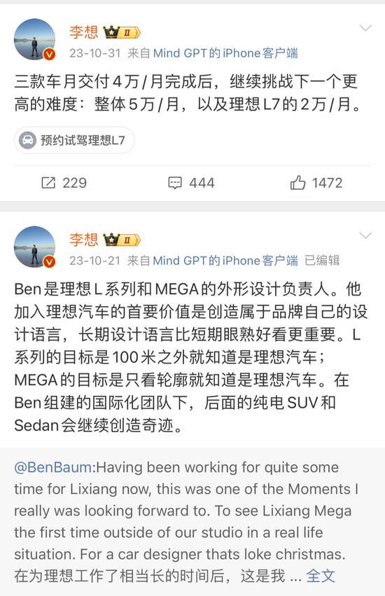 10月21日,李想转发了MEGA外形设计负责人BenBaum的一条微博,之后停更了10天。