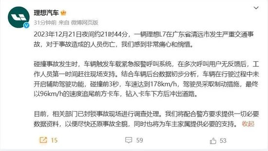 10月27日下午,理想汽车官方微博发布《韩城高速事故说明》,称2023年7月27日夜间23点59分,一辆理想L9在陕西省韩城韦庄高速路发生了严重的交通事故。