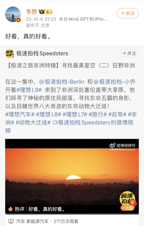 到10月6日,李想转发了一位博主关于理想L9的视频,并表示“好看,真的好看”。