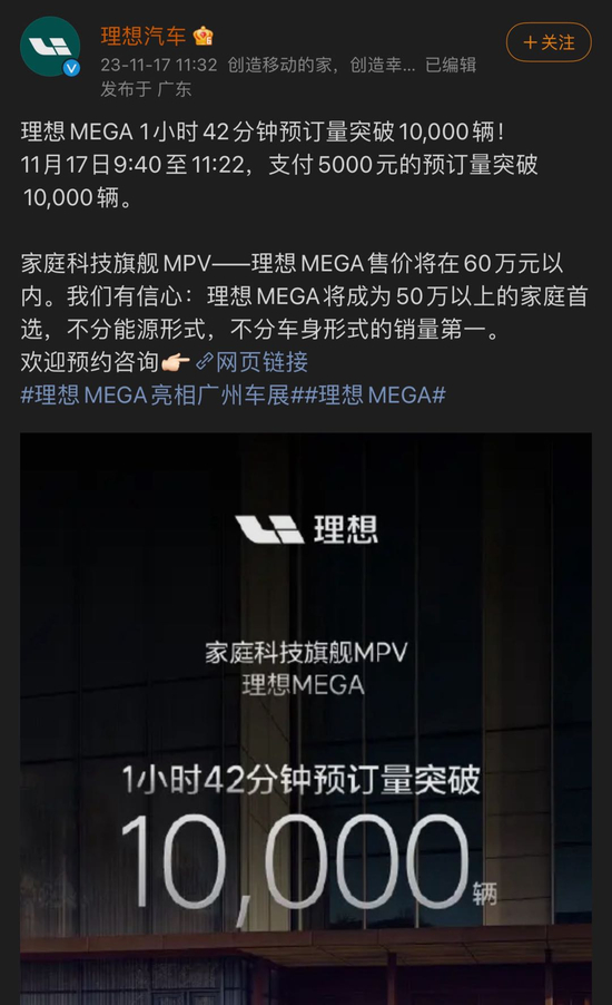 11月17日,理想汽车表示,MEGA 1小时41分钟预定量突破10000辆。