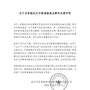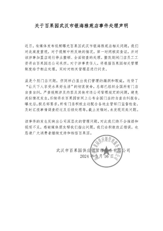 3月16日,百果园发布了一则名为《关于百果园武汉市银海雅苑店事件处理声明》,其中表示,近日,有媒体发布视频曝光百果园武汉市银海雅苑店相关问题,百果园对此高度重视,对于视频中所反映的情况,第一时间核实查证,并对该涉事加盟店进行停业整顿、全面彻查的处理。