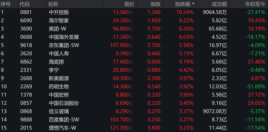 中升控股涨10.24%,海尔智家涨8.22%,美团涨6.26%,领涨蓝筹。