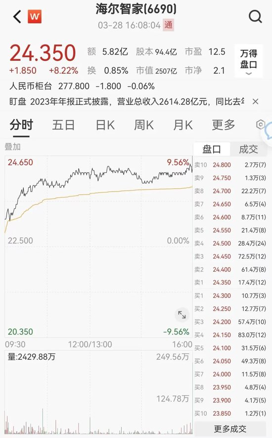 3月28日,在分红、业绩和政策三重利好推动下,海尔智家高开高走,一度大涨9.56%,最终收于24.35港元,上涨8.22%。