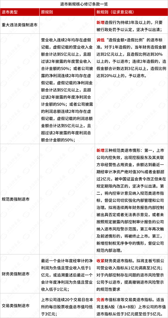 第一,严格强制退市标准。包括,严格重大违法退市适用范围,调低2年财务造假触发重大违法退市的门槛,新增1年严重造假、多年连续造假退市情形;将资金占用长期不解决导致资产被“掏空”、多年连续内控非标意见、控制权无序争夺导致投资者无法获取上市公司有效信息等纳入规范类退市情形,增强规范运作强约束;提高亏损公司的营业收入退市指标,加大绩差公司退市力度;完善市值标准等交易类退市指标。