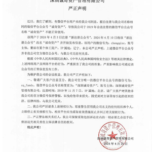 诚奇资产严正声明称:“上述微信平台公众号并非公司官方微信公众号,与公司无任何关系。”