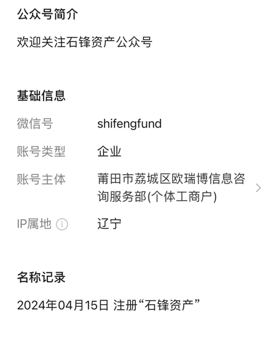被个体工商户“坑”的还有石锋资产,4月中旬,一家名为莆田市荔城区欧瑞博信息咨询服务部的个体工商户注册了“石锋资产”,该公众号如出一辙地改为“欢迎关注石锋资产公众号”,同样发布了多条私募相关的文章。4月22日,石锋资产主体经营的公众号改名并认证为“上海石锋资产管理有限公司”。