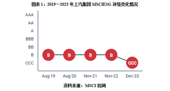 早在2019年,上汽集团便被MSCI纳入其ESG评估名单。MSCI官网显示,2019—2022年,上汽集团的ESG评级均为B级;2023年12月,该公司ESG评级被下调至CCC级。