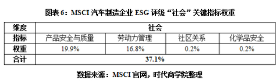 但对于汽车制造行业,MSCI更注重企业在社会责任、公司治理方面的表现。如在MSCI的ESG评级行业指标权重中,环境、社会、治理维度的各项权重分别为29.1%、37.1%、33.9%。