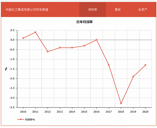 《财富》世界500强数据显示,2012年以来,中国化工集团的利润率一直为负,并于2018年达到历史最低值,利润率为-3.3%;2020年回升至-1.3%。