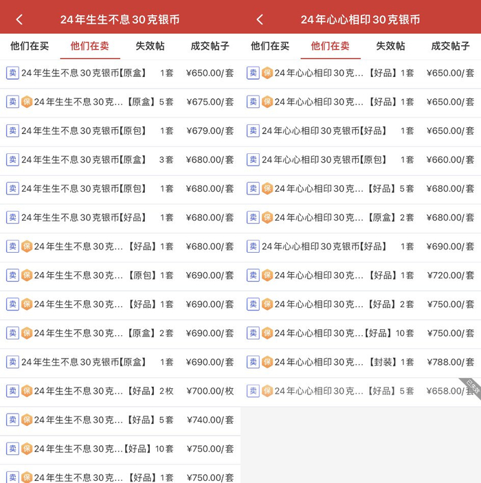 5月24日,时代财经在某钱币交易app看到,相对较受欢迎的生生不息30克银币(发行价620元)的交易最低价为650元,心心相印30克银币(发行价620元)的交易最低价也为650元,溢价并不高。