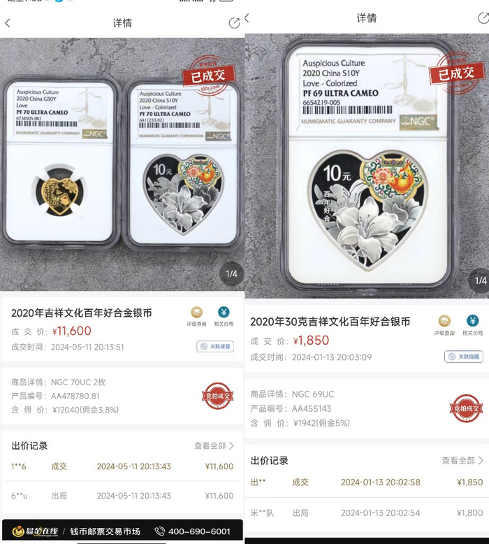 时代财经查询发现,在某钱币交易app上,直至今年5月,尚有2020年吉祥文化百年好合金银币以11600元的价格成交,而当年此款纪念币的发行价为2520元,涨幅高达360%。当年发行价为520元的30克吉祥文化百年好合银币也在今年1月曾以1850元成交,涨幅高达255%。