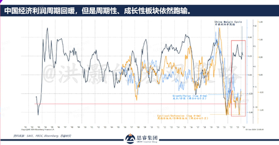 中国的利润周期用深蓝色的线表达;黄色的线和亮蓝色的线,是成长比价值,周期比防御。