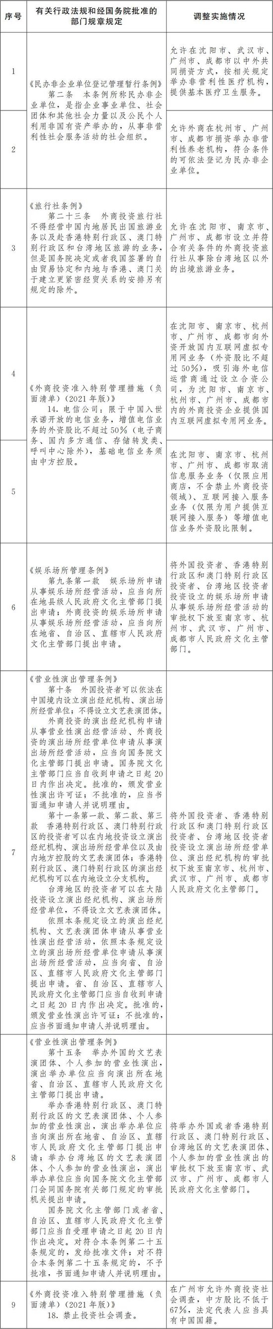7月11日,国务院发布公告,同意自即日起,在沈阳市、南京市、杭州市、武汉市、广州市、成都市等6个服务业扩大开放综合试点城市暂时调整实施《民办非企业单位登记管理暂行条例》、《旅行社条例》、《娱乐场所管理条例》、《营业性演出管理条例》、《外商投资准入特别管理措施(负面清单)(2021年版)》的有关规定。