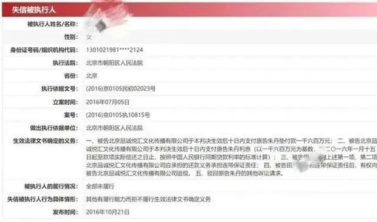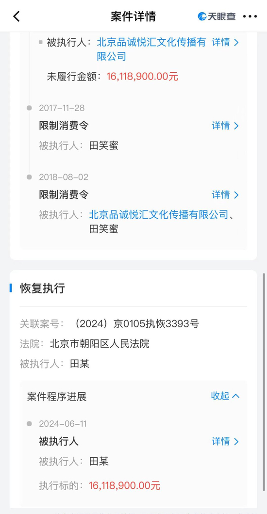 案件流程显示,2016年7月,该案件首次执行。此后,田笑蜜及其与朱丹共同经营的北京品诚悦汇文化传播有限公司被列为失信被执行人,并被限制高消费,该案也被列为终本案件。